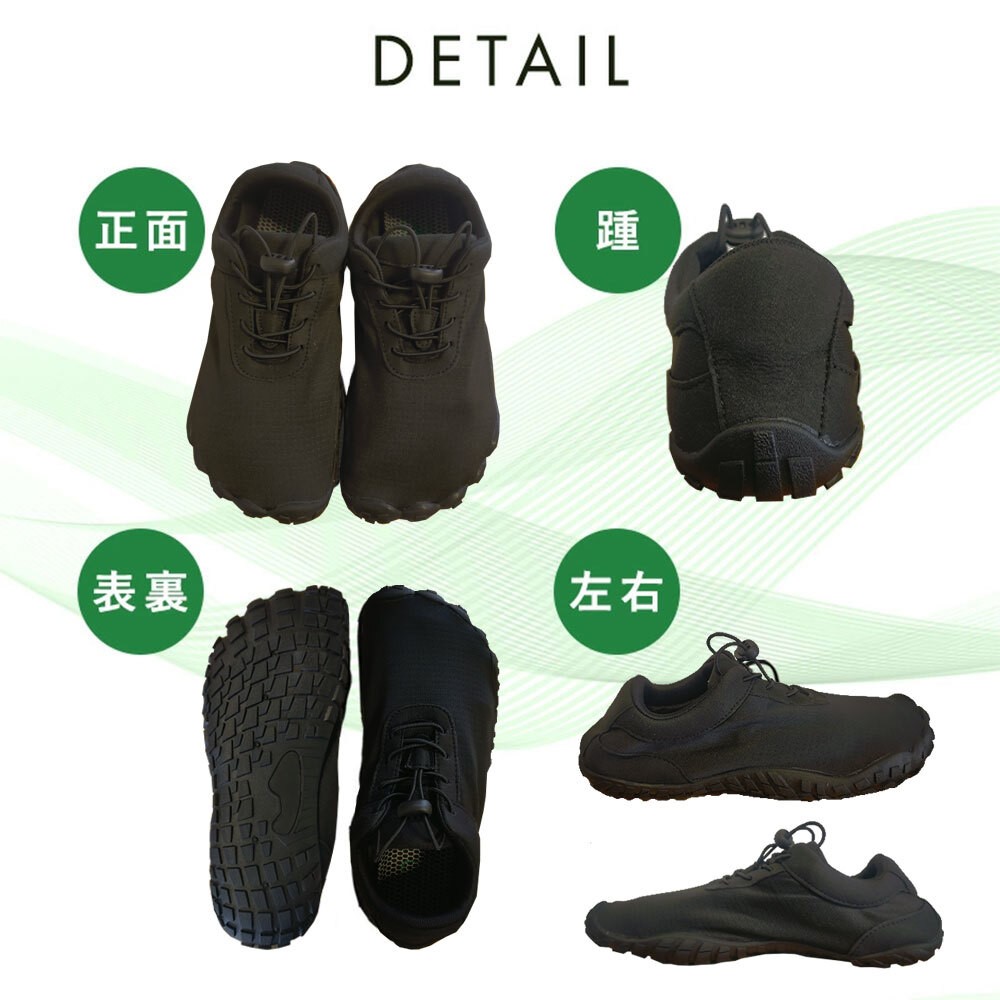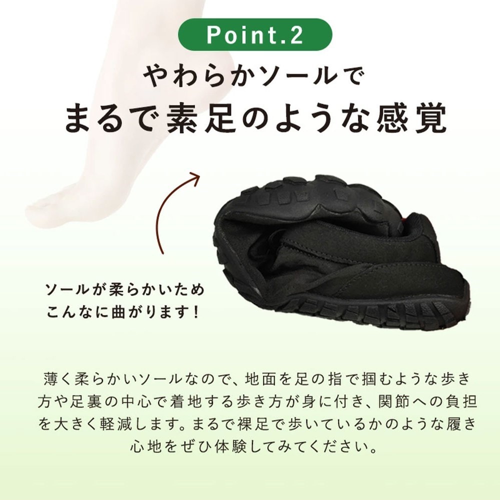 | 主な特徴 | このシューズは、薄いソールで軽く、裸足で歩いたり走ったりする感覚に近いデザインです。足の指をしっかり使って歩行することができます。