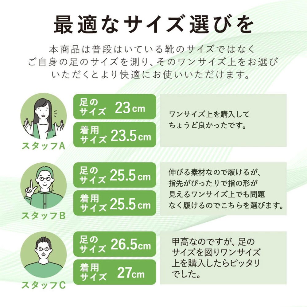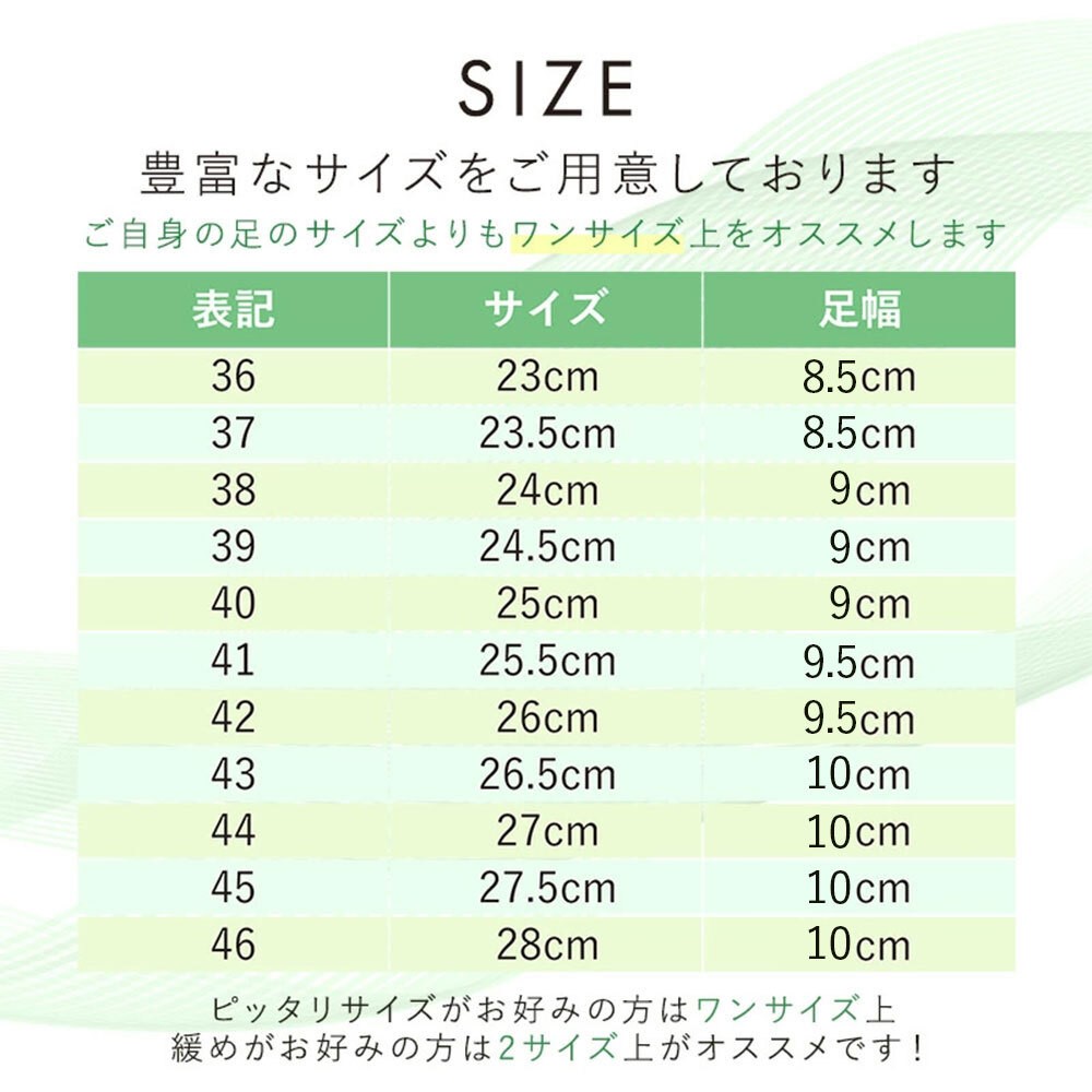 | サイズ | 23cm/23.5cm/24cm/24.5cm 25cm/25.5cm/26cm/26.5cm 27cm/27.5cm/28cm ※実際の足のサイズより1〜1.5cm上のサイズをおすすめしています。 |