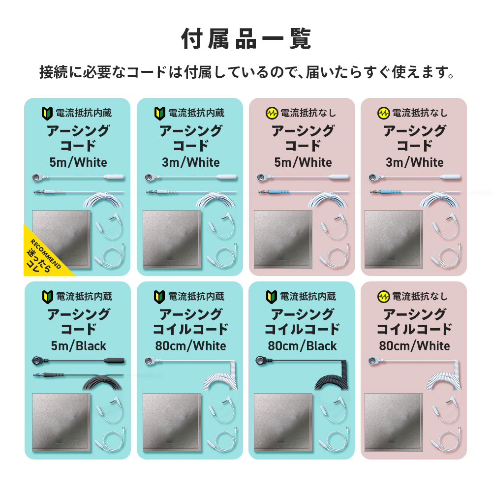 | 安全設計 | 付属のオリジナル専用コードは、日本のアース規格に準拠して家庭用に設計されています。耐久性のある銅線を使用し、長持ちする仕様です。おすすめは5mの抵抗内蔵コード(100kΩ抵抗内蔵)で、以下の特徴があります。