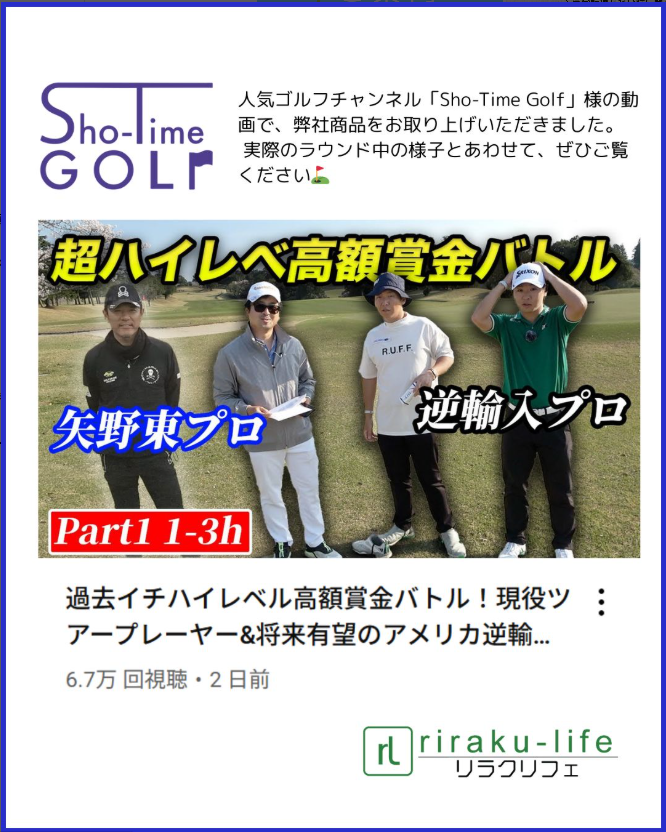 YouTubeチャンネル「Sho-Time GOLF」様の動画で、 弊社riraku-life(リラクリフェ)の製品を取り上げてい ただきました🎥 ラウンド中のアイテムのひとつとして、 Earthiness Health […]