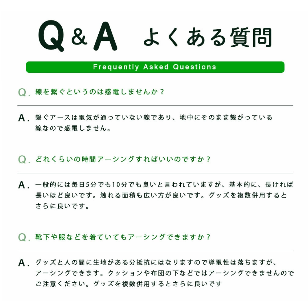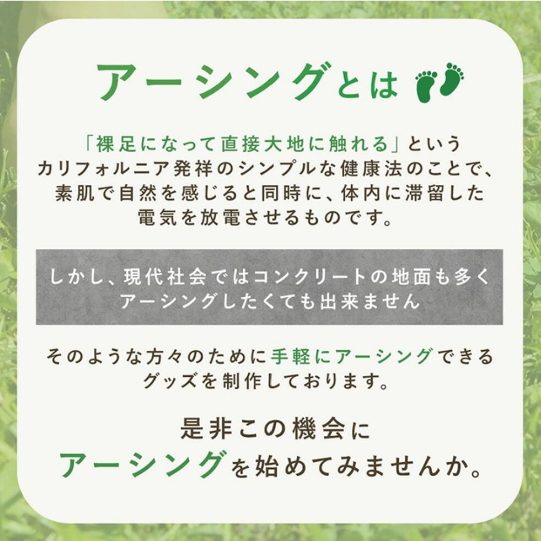 | 品質保証 | 当社はアーシンググッズ専門店として、常に品質の高い日本製造の製品とサービスの提供を目指しています。私たちの製品は、導電性を考慮した素材を採用していますので安心してご利用いただける設計です。また、ご購入後も充実したサポート体制を整えております。 |