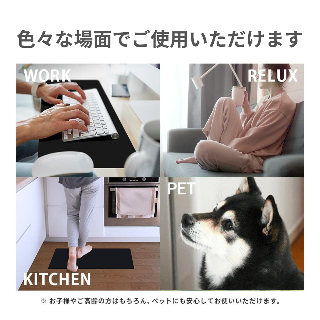 | 使用方法 | ・フットマットとして床に敷く ・ノートPCやキーボード下に敷いてデスクマットとして シンプルなデザインだから場所を選ばず使えます。 |