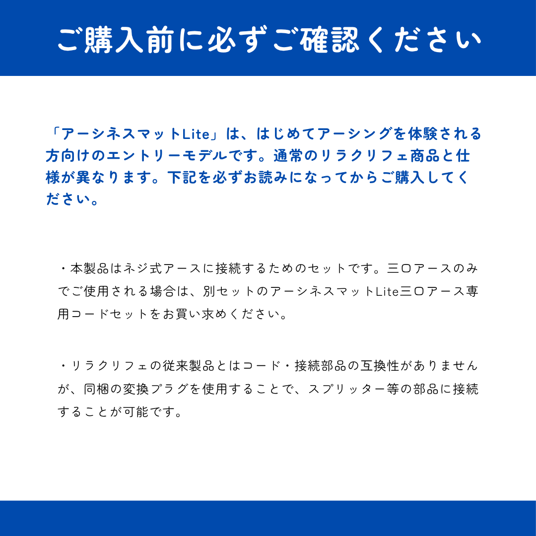 | 通常のEPPマットとの比較 | アーシネスマットLiteは、はじめてアーシンググッズを使う方や、サブ用として気軽に使いたい方におすすめの、お試し・入門モデルです。どちらを選ぶか悩んだら、アーシネスマットEPPをおすすめします。 |