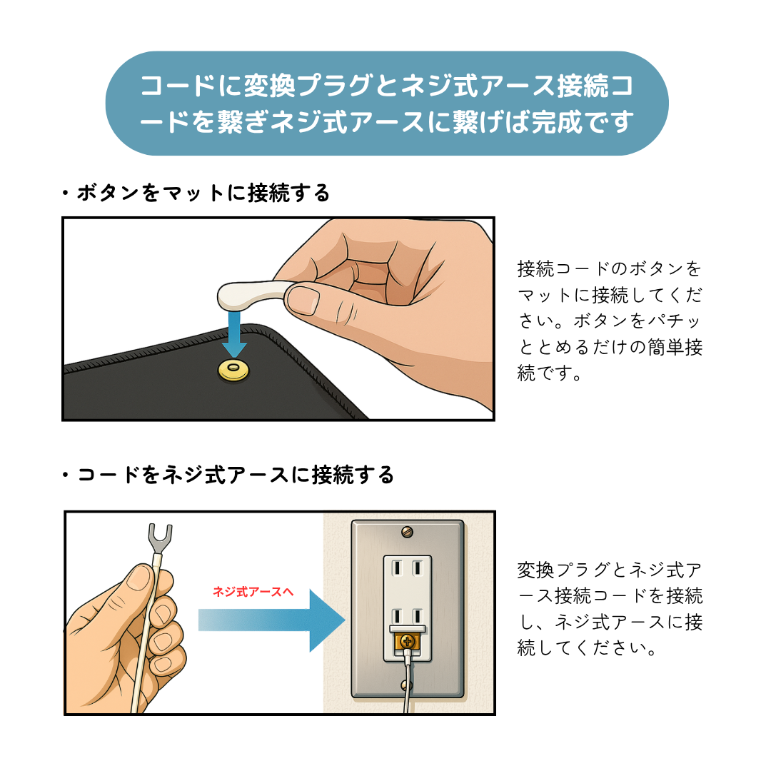 | 接続方法 | マットにボタンでコードを取り付け、もう一方をご家庭のネジ式アースに接続するだけの簡単接続です。 |