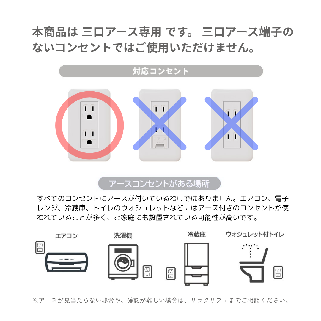アース端子のないコンセントではご使用いただけませんので、必ずご確認のうえご使用ください。