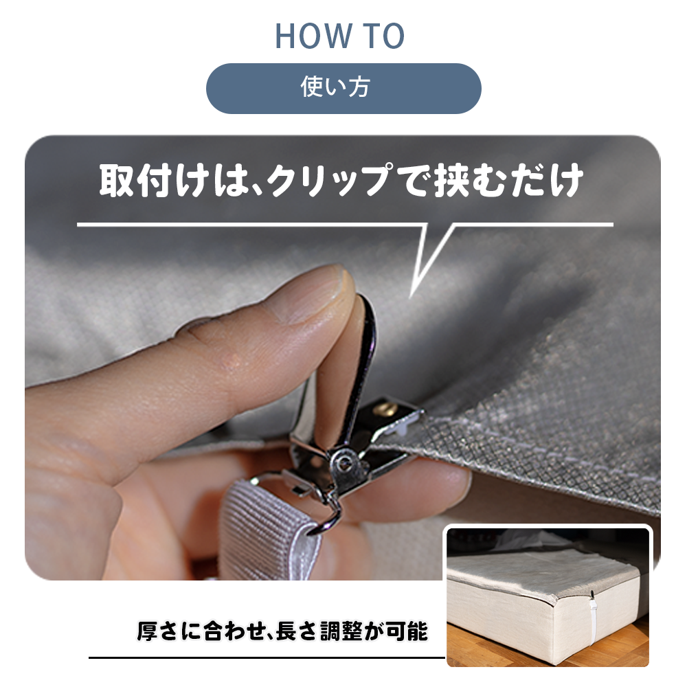 | 付属品 | ・ズレ防止シーツクリップ×4本(20〜伸ばして70cm長さ調節可能)