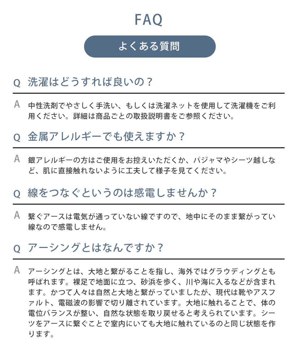 当社はアーシンググッズ専門店として、常に品質の高い日本製造の製品とサービスの提供を目指しています。私たちの製品は、導電性を考慮した素材を採用していますので安心してご利用いただける設計です。また、ご購入後も充実したサポート体制を整えております。 |
