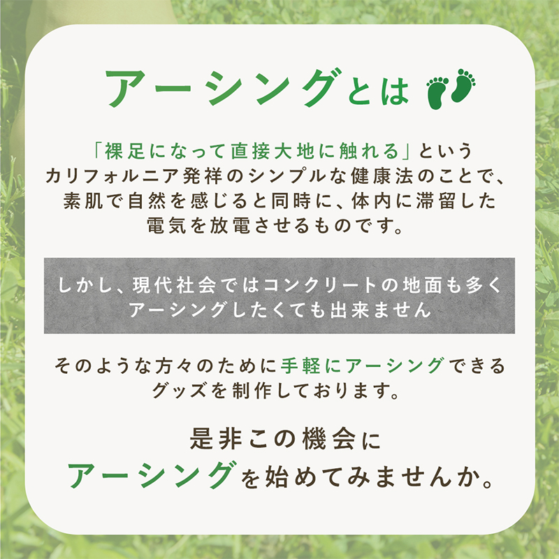 品質保証 当社はアーシンググッズ専門店として、常に品質の高い日本製造の製品とサービスの提供を目指しています。私たちの製品は、導電性を考慮した素材を採用していますので安心してご利用いただける設計です。また、ご購入後も充実したサポート体制を整えております。