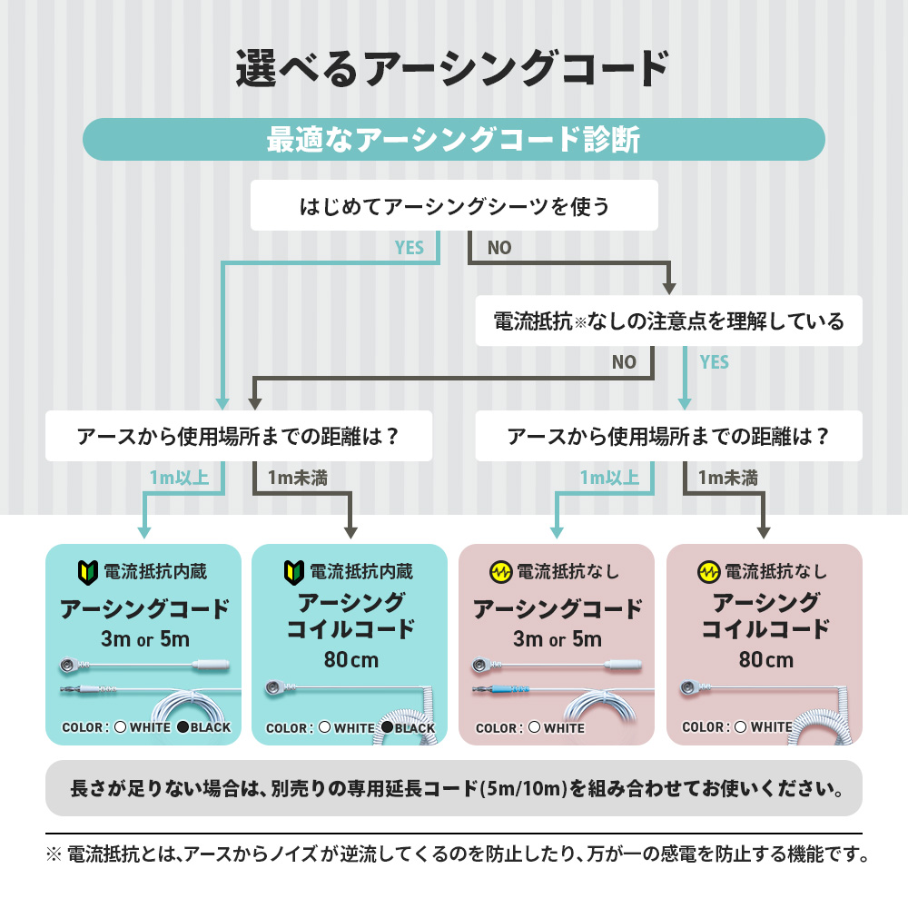 | 安全設計 | 付属のオリジナル専用コードは、日本のアース規格に準拠して家庭用に設計されています。耐久性のある銅線を使用し、長持ちする仕様です。おすすめは5mの抵抗内蔵コード(100kΩ抵抗内蔵)で、以下の特徴があります。