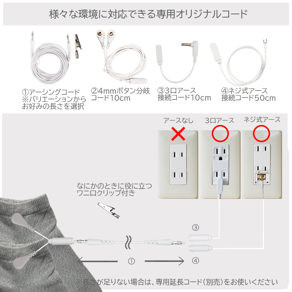 | 主な特徴 | アーシネスサポーターにはコードが付けれるようにボタンが付いています。 肘、膝、ふくらはぎなどを部分的に使用できます。 |