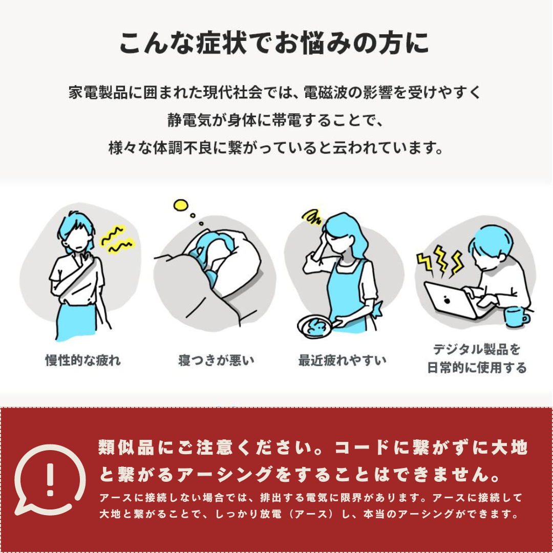 | 品質保証 | 当社はアーシンググッズ専門店として、常に品質の高い日本製造の製品とサービスの提供を目指しています。私たちの製品は、導電性を考慮した素材を採用していますので安心してご利用いただける設計です。また、ご購入後も充実したサポート体制を整えております。 |