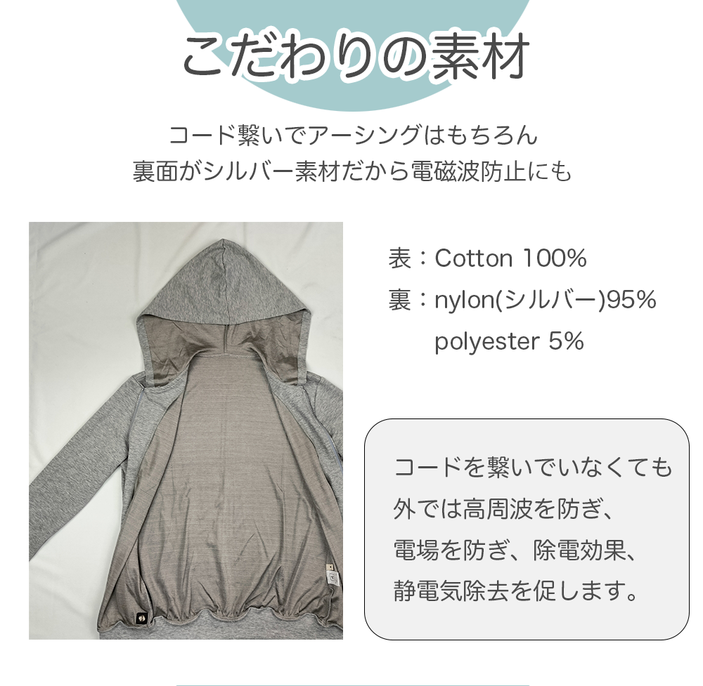 内側は純銀95%なので、心地よい肌触りを提供する高品質な電磁波シールドパーカーです。この純銀素材は、電磁波シールドとして機能し、低周波帯の電場や高周波(MHz〜GHzの周波数)の影響を軽減する効果があります。※別売りのコードを使用しアースに接続することも可能です。