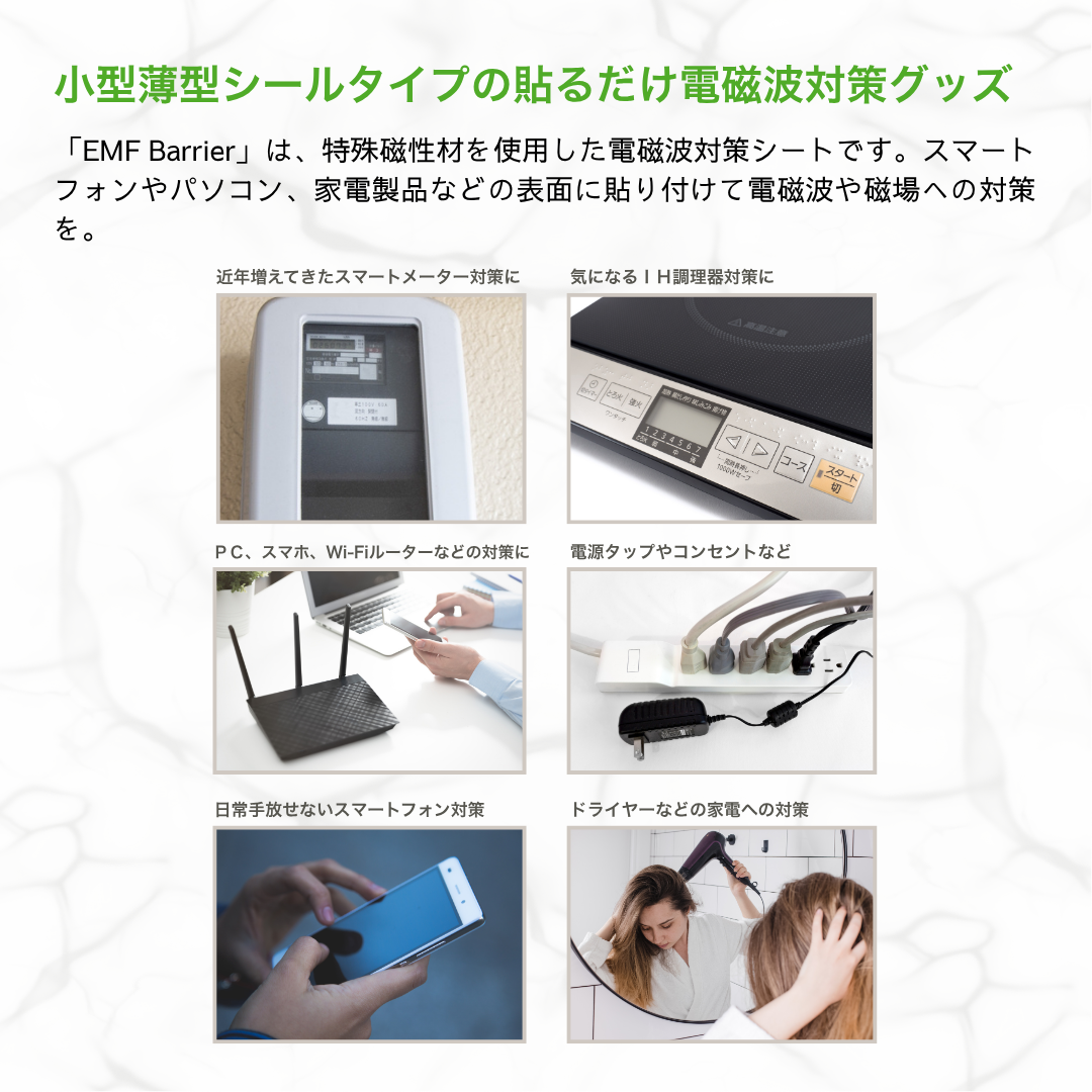 | 使用方法 | スマートフォン、ノートパソコン、スマートメーター、Wi-Fiルーター、その他各家電など、電磁波が気になるデバイスに貼り付けてください。しっかりとした接着面に固定することで、安定した使用が可能です。