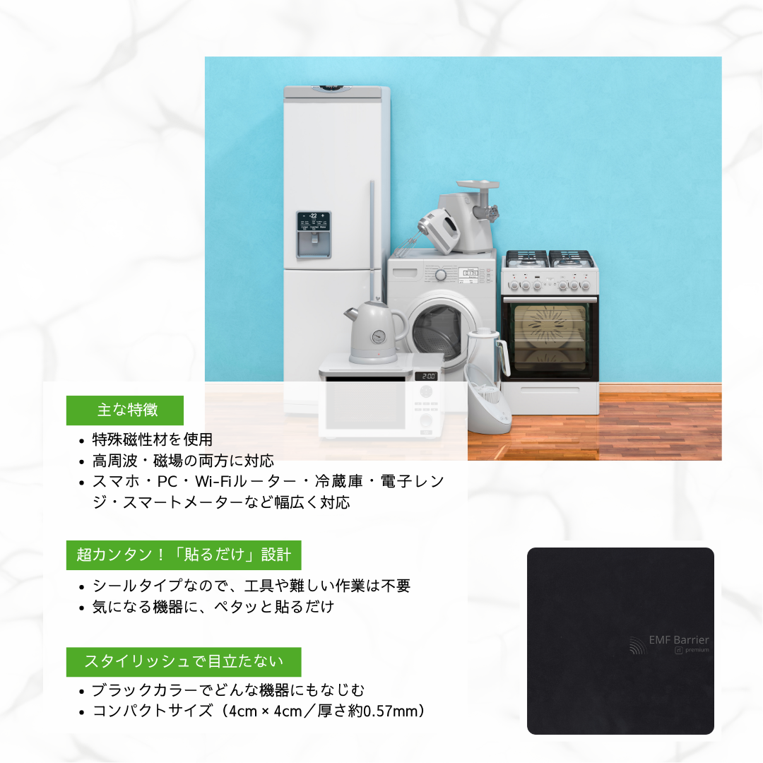 | 特長とメリット | ・ 高周波・磁場対策:特殊磁性素材を使用した設計 ・ 貼るだけの簡単仕様:工具不要・メンテナンス不要 ・ 幅広く使える:スマホ、PC、家電、スマートメーターなど多様な機器に対応 ・ 目立たず使えるデザイン:どんな機器にもなじみやすいマットブラック |