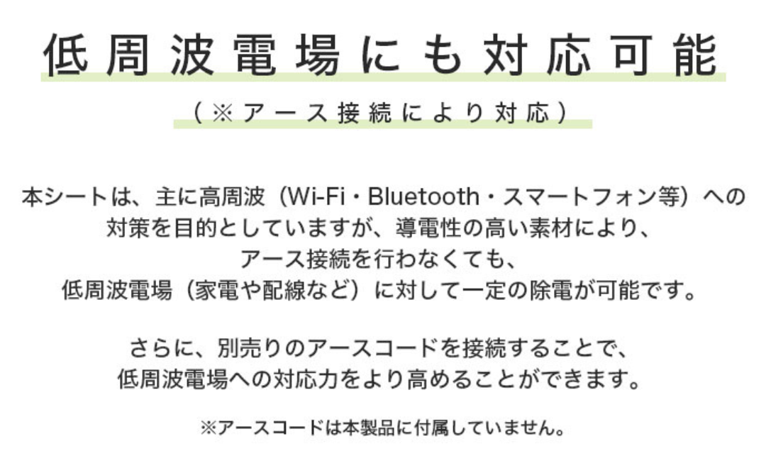 | ご注意 | ※電磁波測定器では、電場の正確な測定ができない場合があります。 ※磁場は別の対処方法が必要ですので、事前にご確認ください。 ※低周波の電場には効果が限定的なため、アースに接続することが推奨されます。 ※アースに接続する専用コードは別途お買い求めください。 |