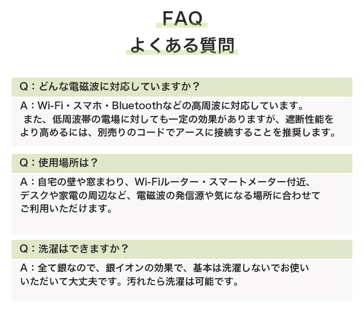 | お手入れ方法 | ・基本的に洗濯は不要です。 ・洗濯する場合は水洗いをおすすめします。洗剤を使用する場合は中性洗剤をご使用ください。 ※洗濯を繰り返すとシールド性能や導電性が徐々に低下する可能性があります。 ・製品の寿命の目安は、通常の環境下で洗濯をしなければ3〜5年程度です。空気に触れることで酸化が進むため、保管環境にもご注意ください。 |
