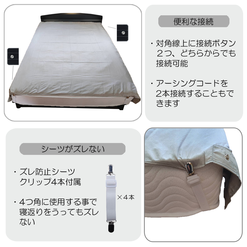 付属品 ・ズレ防止シーツクリップ×4本(20〜伸ばして70cm長さ調節可能)