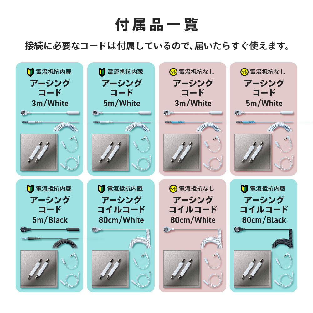 安全設計 付属のオリジナル専用コードは、日本のアース規格に準拠して家庭用に設計されています。耐久性のある銅線を使用し、長持ちする仕様です。おすすめは5mの抵抗内蔵コード(100kΩ抵抗内蔵)で、以下の特徴があります。