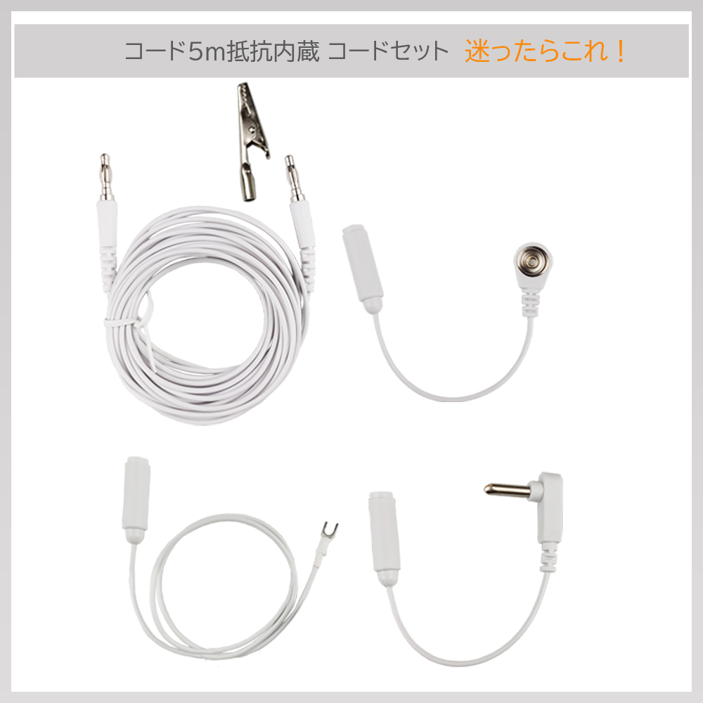 安全設計 付属のオリジナル専用コードは、日本のアース規格に準拠して家庭用に設計されています。耐久性のある銅線を使用し、長持ちする仕様です。おすすめは5mの抵抗内蔵コード(100kΩ抵抗内蔵)で、以下の特徴があります。