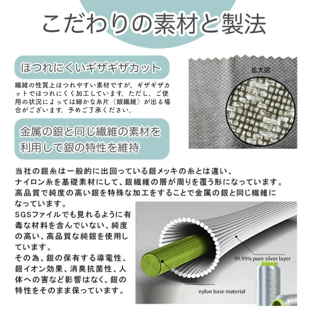 | 素材 | ・高品質純銀ナイロン100% ・銀糸を使用したこの素材は、非常に高い導電性を持ち、銀イオンによる抗菌、消臭、殺菌効果に優れ、肌に直接触れても安全です。薄くて柔らかい素材です。 ※製品の特性上、製造過程で多少の色ムラやシミ、斑点が発生する場合がありますが、品質や性能に影響はありませんのでご了承ください。 |