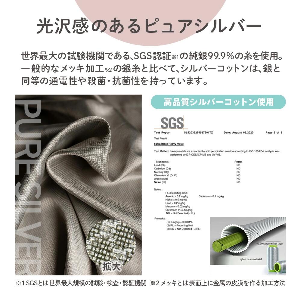 | お手入れ方法 | ・純銀なので銀イオンの効果で、抗菌、消臭、殺菌効果があり、基本洗濯は不要です。 ・洗濯をすることでも徐々に導電性がなくなってしまいます。 ・基本的には水洗いをお勧めします。 洗濯機での洗濯は可能です。ネットに入れて洗濯してください。 ・洗濯する際に、洗剤を使用する場合は、柔軟剤や静電気防止剤の入っていない中性洗剤を使用してください。柔軟剤、静電気防止剤は銀糸に膜を張ってしまう為、導電性がなくなってしまう原因になりますのでご注意ください。 |