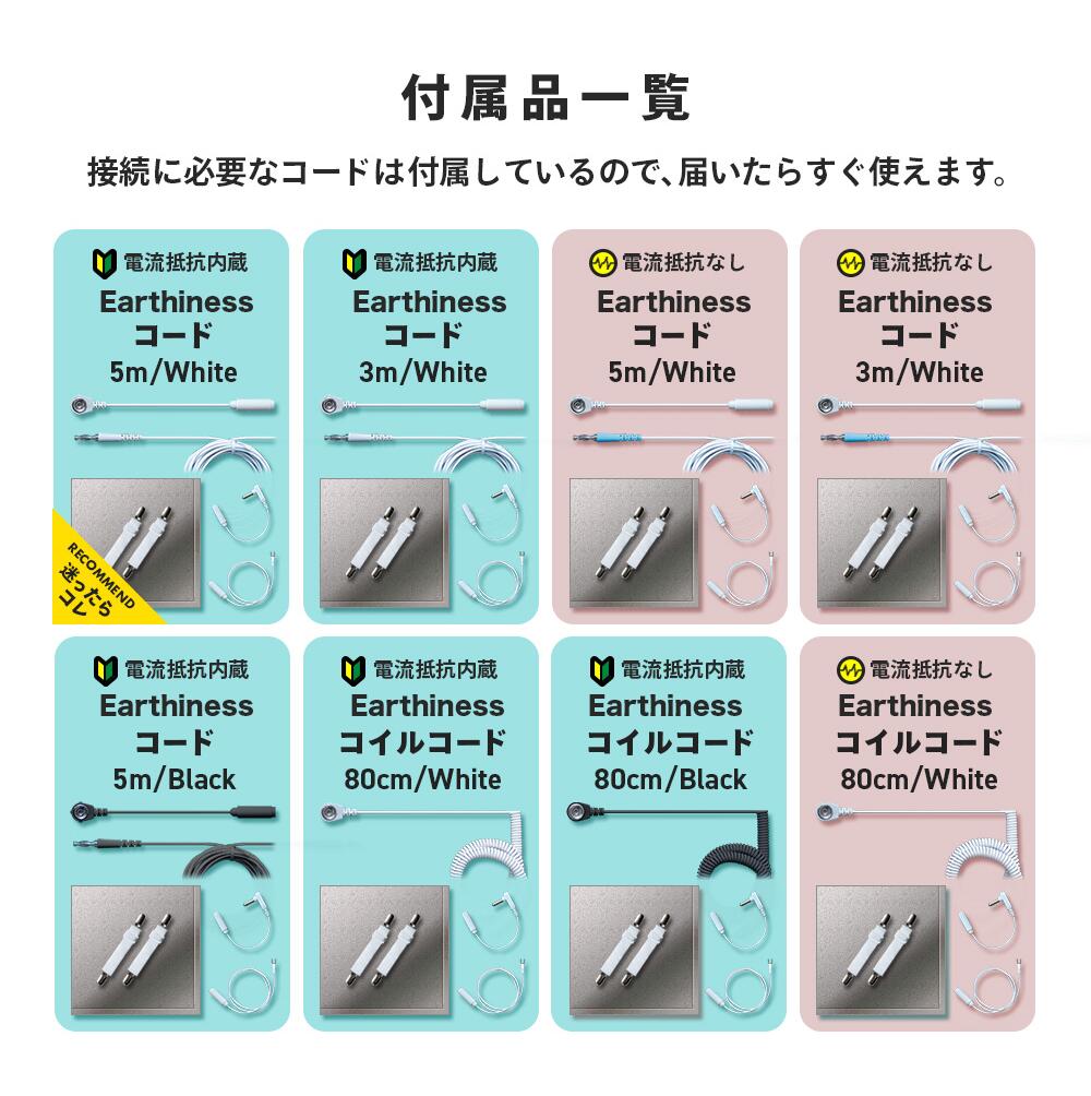 | 安全設計 | 付属のオリジナル専用コードは、日本のアース規格に準拠して家庭用に設計されています。耐久性のある銅線を使用し、長持ちする仕様です。おすすめは5mの抵抗内蔵コード(100kΩ抵抗内蔵)で、以下の特徴があります。