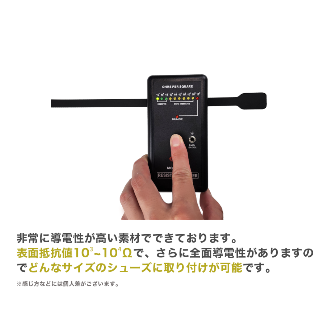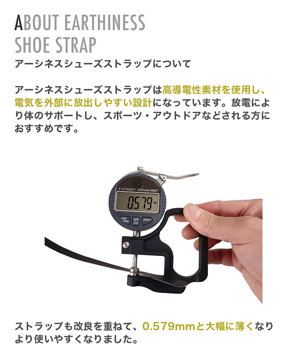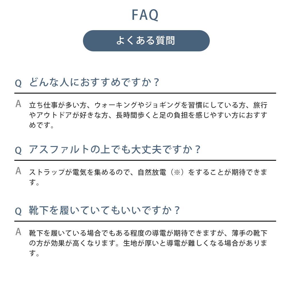 | よくある質問 | Q.アスファルトの上でもアーシングできますか? A.基本的には難しいですが、ストラップが電気を集めるので、自然放電(※)をすることが期待できます。 アスファルトが古い場合など条件によっては導電が生じる可能性があります。特に雨でアスファルトが濡れている場合は、導電がしやすくなります。 Q.室内でもアーシングできますか? A.室内では大地との接続がないためアーシングは難しいですが、ストラップが電気を集めるので、自然放電(※)をすることが期待できます。 Q.靴下を履いていてもアーシングできますか? A.靴下を履いている場合でもある程度の導電が期待できますが、薄手の靴下の方が効果が高くなります。生地が厚いと導電が難しくなる場合があります。 より効率的な導電を求める場合は、専用のアーシネスソックスをご利用いただくことをお勧めします。※電気は電気の通しやすい所に集まり、一定以上集まると自然放電します。 |