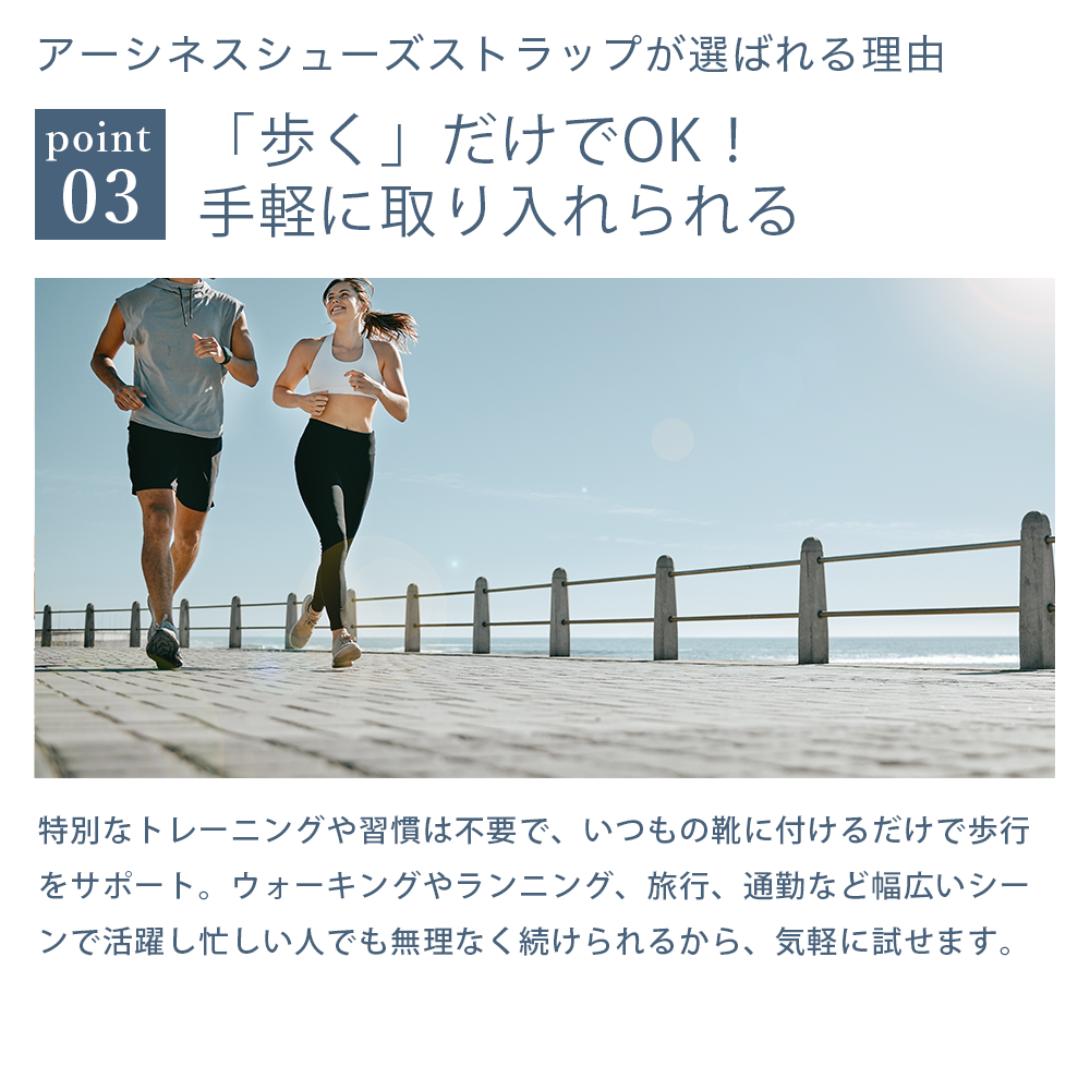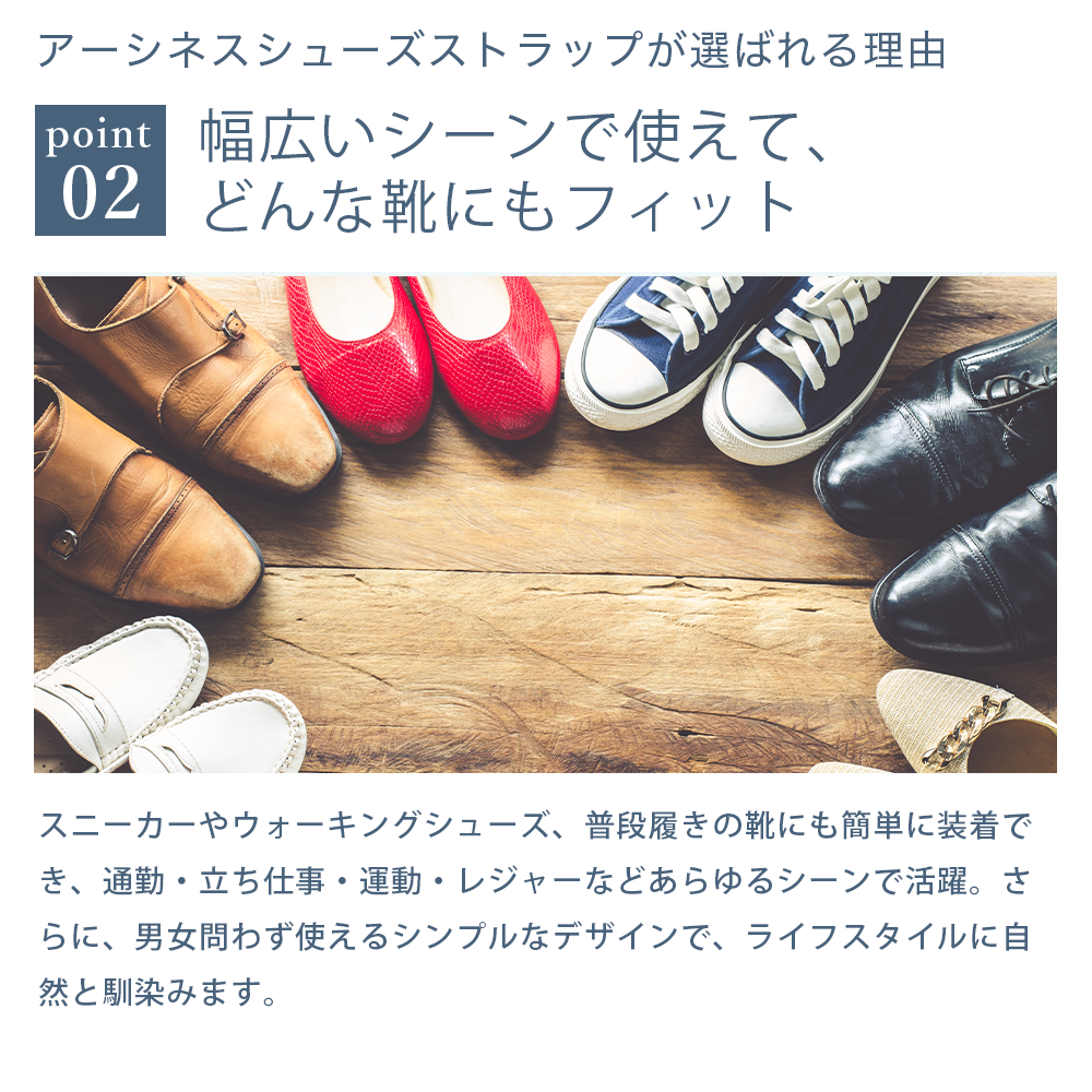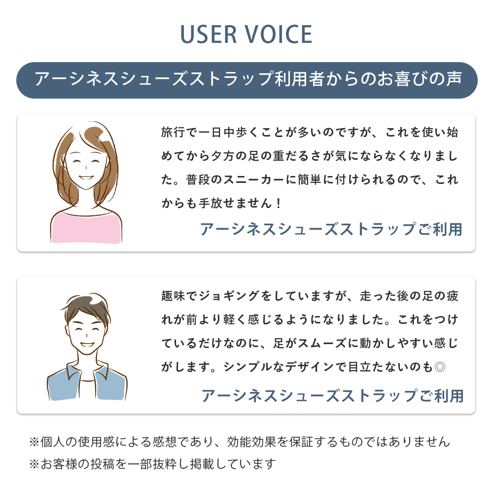 | 使用上の注意点 | 耐久性に関して ・貼り付け方や歩き方などで変わってくる為 貼り付けの際は、靴の汚れをや油分をしっかり落として貼り付けてください。 また水にぬれると剥がれやすくなるので雨の日の使用は避けるようにしてください。 ストラップが擦れるような歩き方などをしてしまうと剥がれやすくなってしまう可能性がございます。 ・使用期間の目安 当店のスタッフが日常生活で使用し雨も気にせず使用した2〜3か月は使用可能でした。 ・白い靴下を使用した場合 擦れや汗などで、布に炭素の成分(黒色)が付着する可能性があります。 おすすめは黒い靴下です。 |