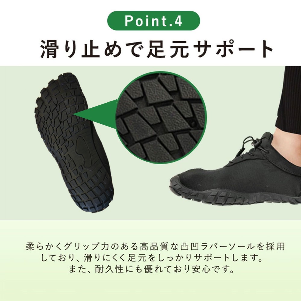 主な特徴 このシューズは、薄いソールで軽く、裸足で歩いたり走ったりする感覚に近いデザインです。足の指をしっかり使って歩行することができます。